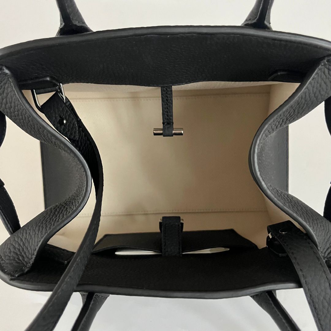 Open top with toggle closure. Gusseted sides with adjustable buckle. One main compartment with interior slip pocket