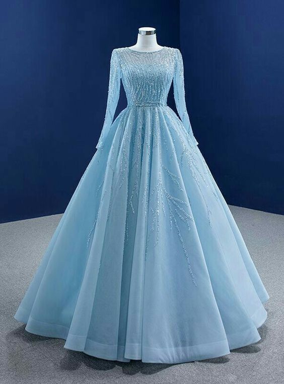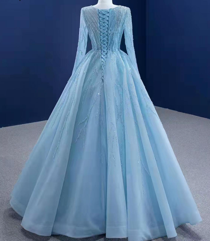 Tulle A Line Elegant Light Blue Evening Dress New O Neck Sequined Lace Formal Prom Gowns fg6464