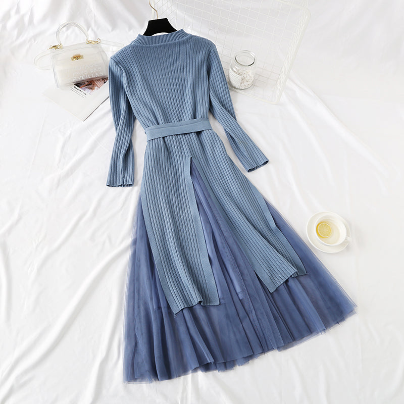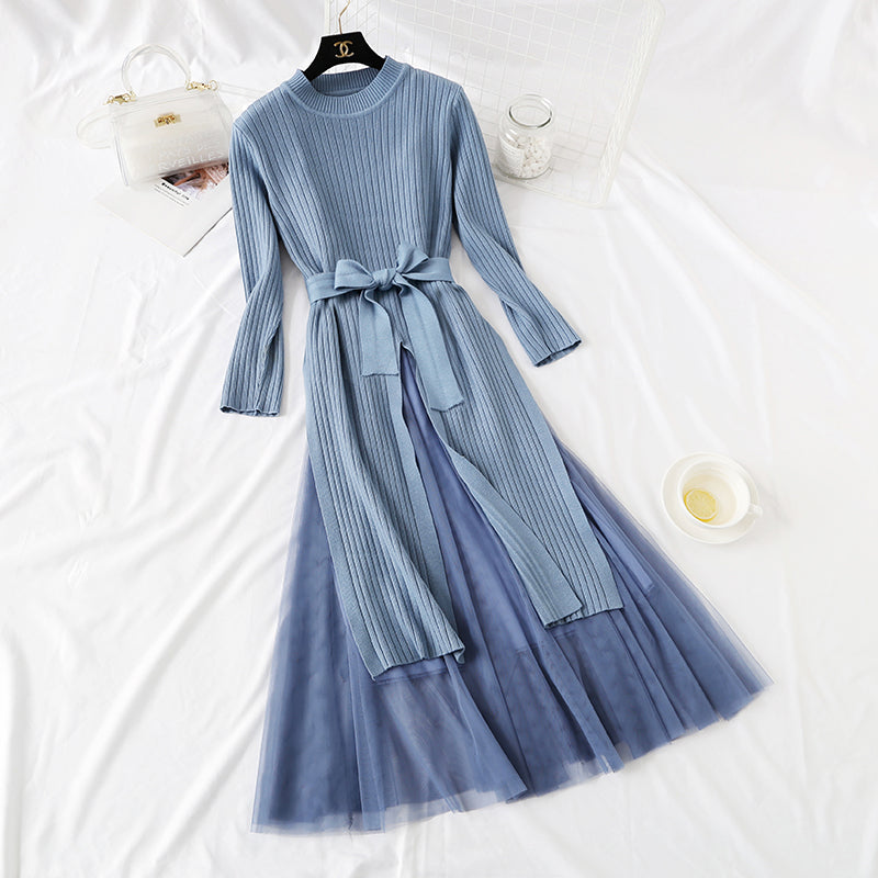 Two piece set of net red winter dress with mesh bottom skirt 2347