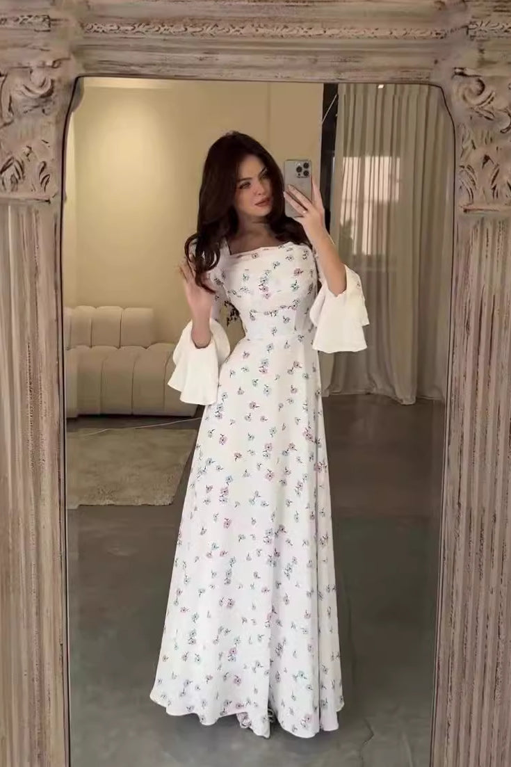 loveedsTM-U-neck printed long-sleeved trumpet sleeves fashionable slim fit women's dress