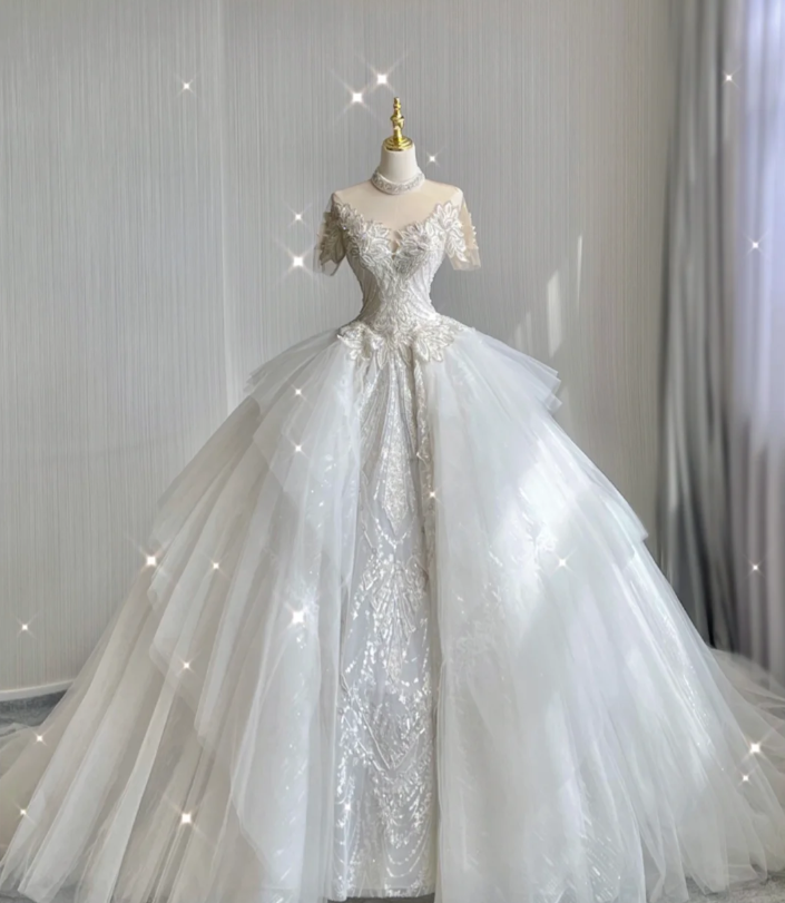 Unique Ball Gown High Neckline Lace Long White Wedding Dresses Summer Brides Dress DP416