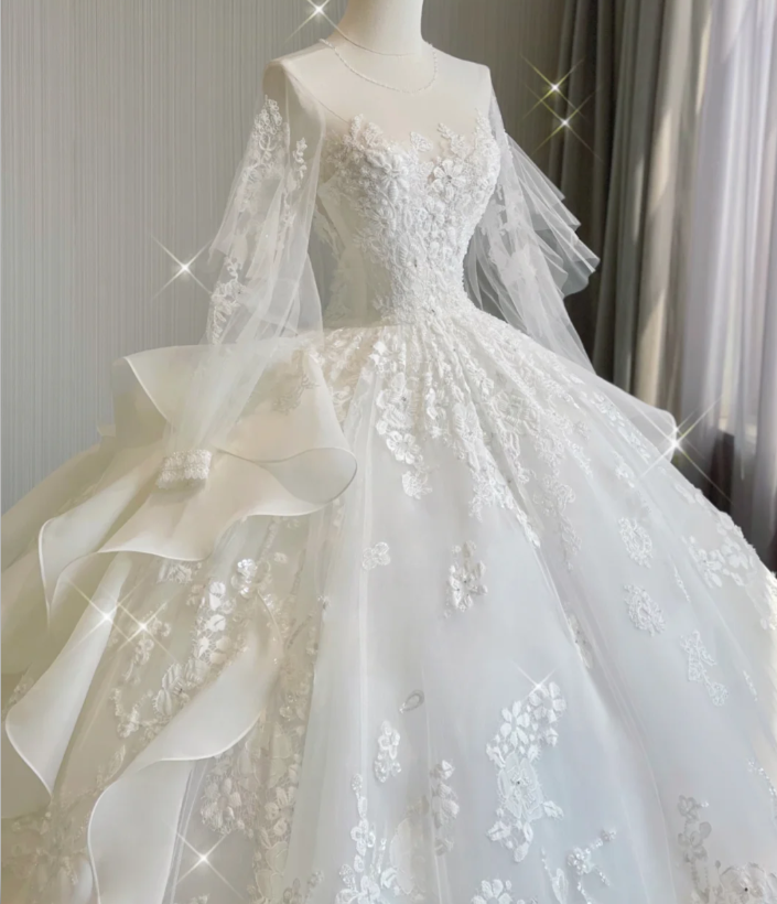 Unique Ball Gown Scoop Neckline Lace Long Sleeves White Wedding Dresses Brides Dress DP419