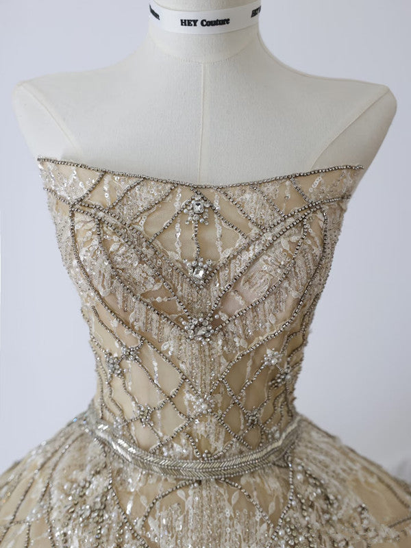Unique Ball Gown Strapless Tulle Champagne Long Wedding Dresses Brides Dress S3812