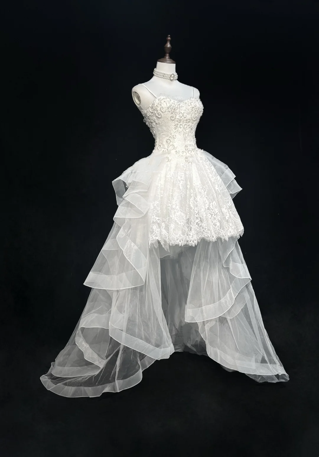 Unique Bridal Gown High Low Spaghetti Straps Lace Sleeveless White 50s Wedding Dresses Modest Bridal Gowns DH1115