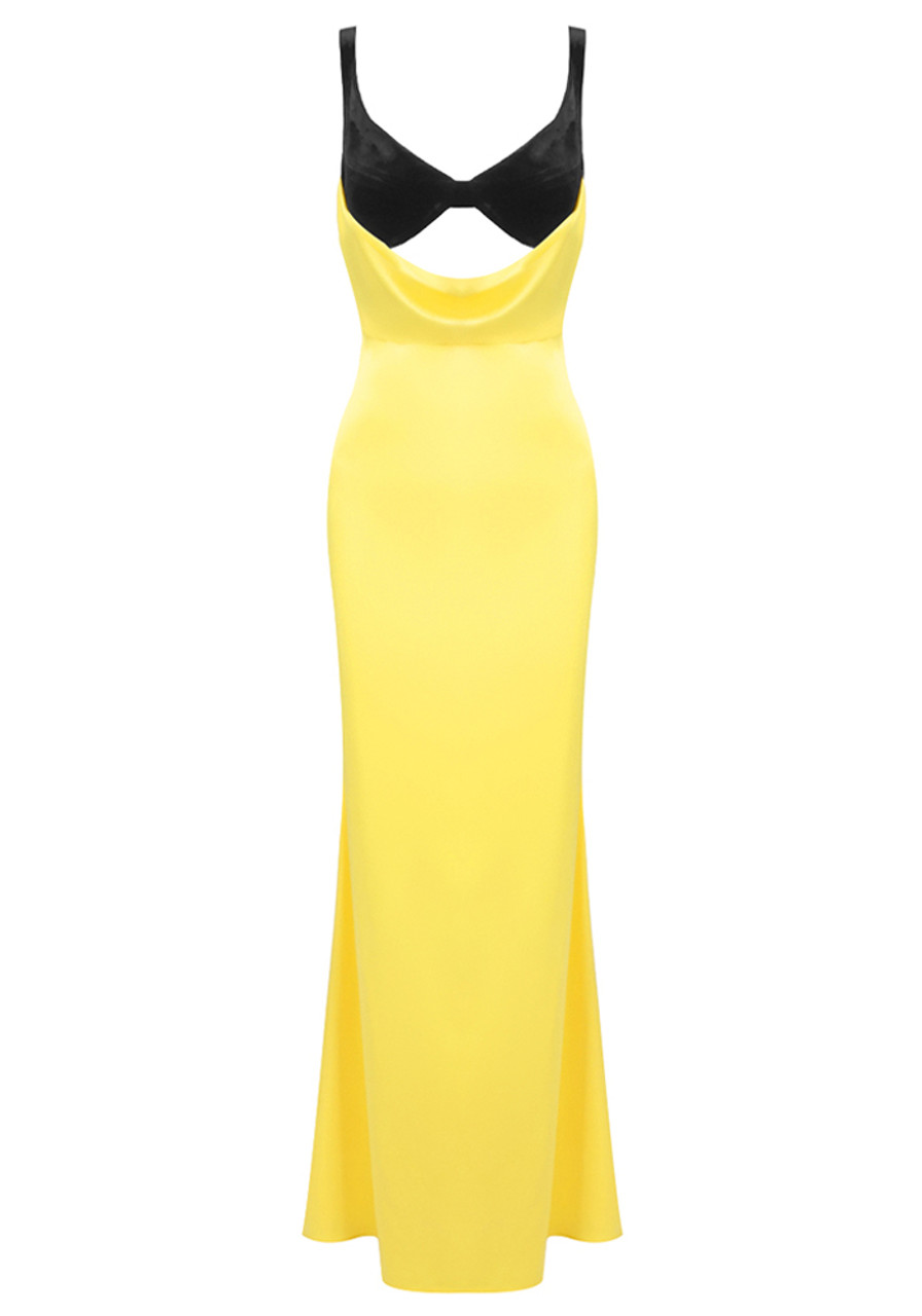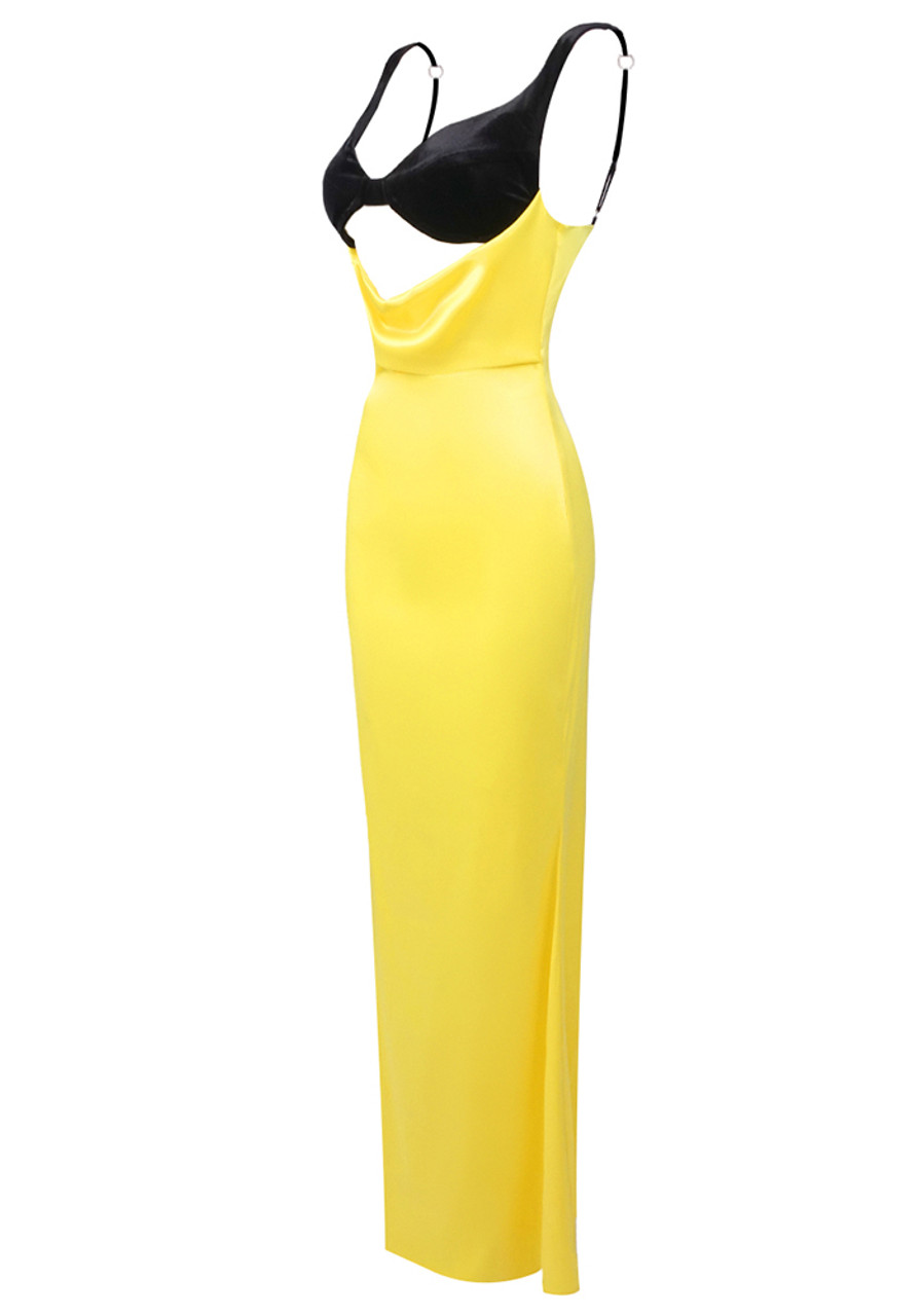 Unique Sheath Straps Yellow Black Satin Long Prom Dress Evening Dress SH3828