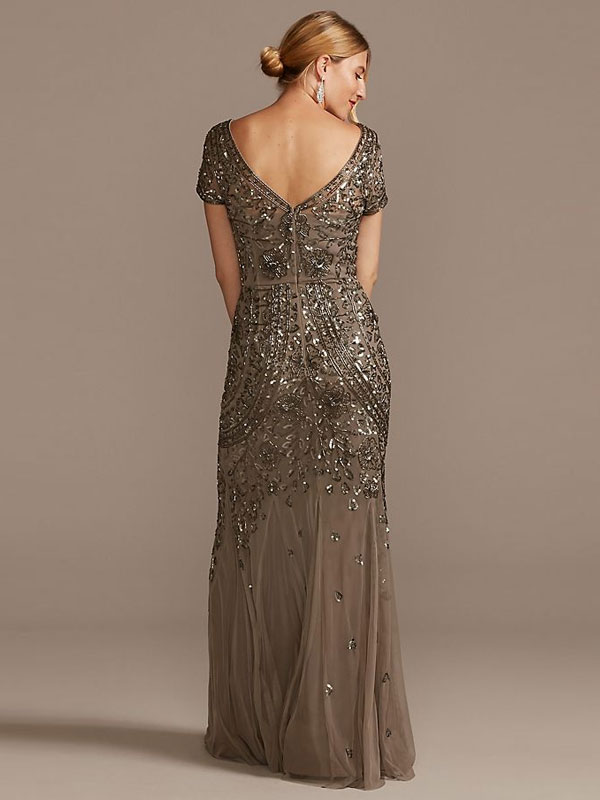 V-neck Beaded Short Sleeve Dress with Godets Mother of the Bride Dress