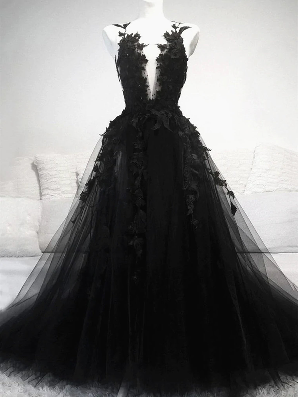 V Neck Black Lace Prom Dresses,Vintage Long Formal Graduation Dress