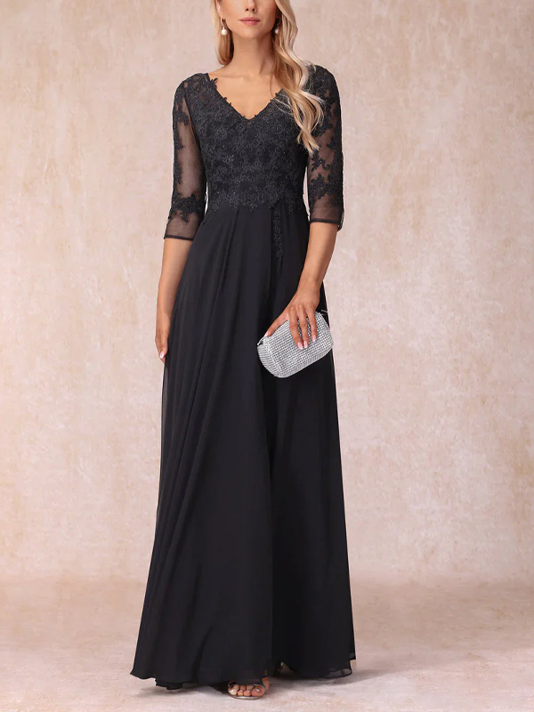 V-Neck Lace Mesh Solid Color Maxi Dress
