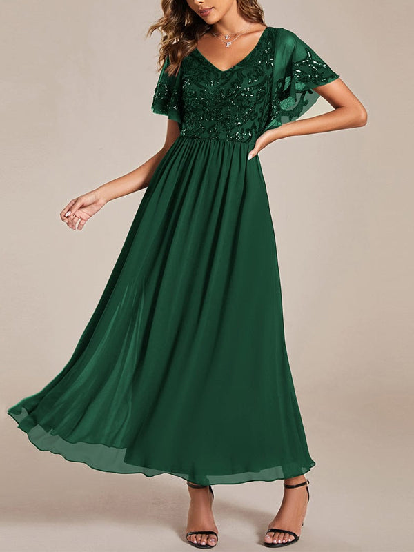 V-neck Lace Sequin Solid Color Maxi Dress