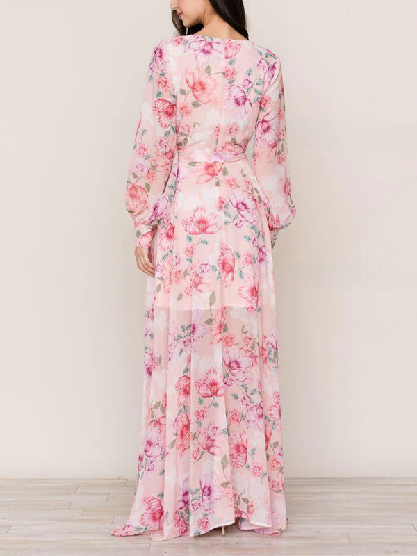 V-neck Pink Long-sleeve Printed Maxi Dress