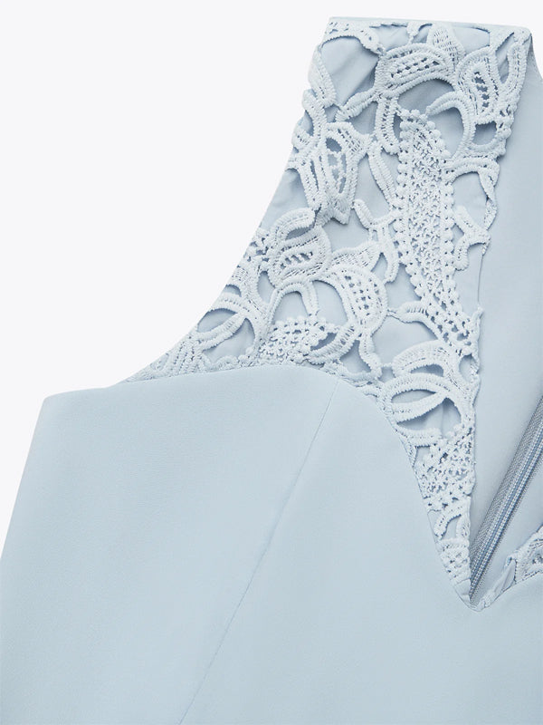 V-neck Sleeveless Lace Solid Color Midi Dress