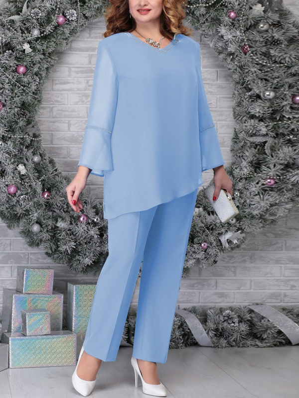 V-Neck Solid Color Hem Irregular Top And Trousers Suit