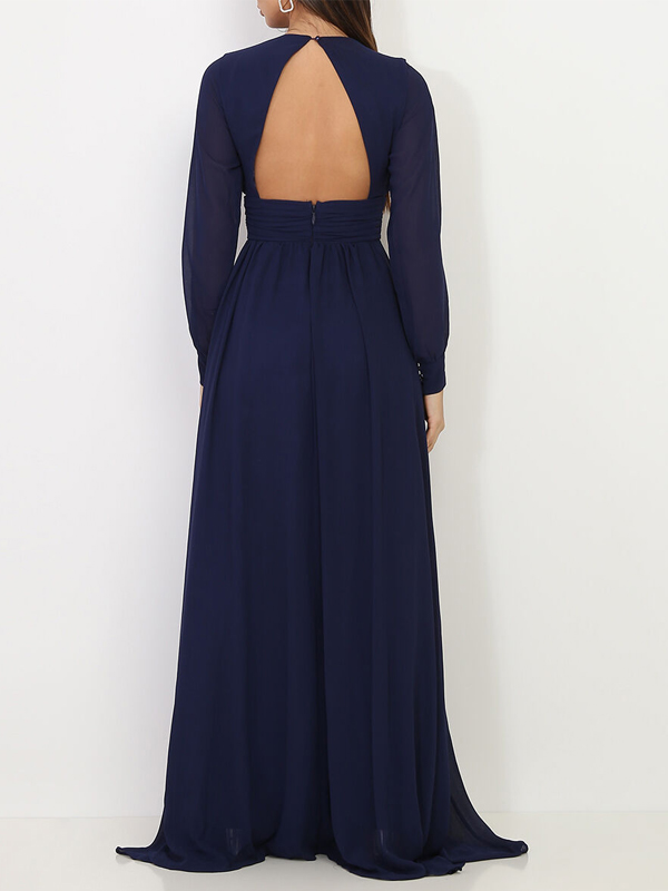 V-neck Solid Color Long Sleeve Chiffon Maxi Dress