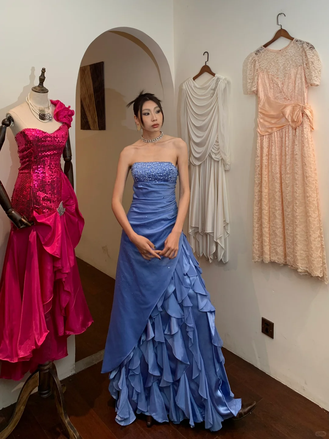 Vintage A Line Strapless Beaded Sequin Ruffle Blue Satin Long Prom Dress Party Dress SH3035