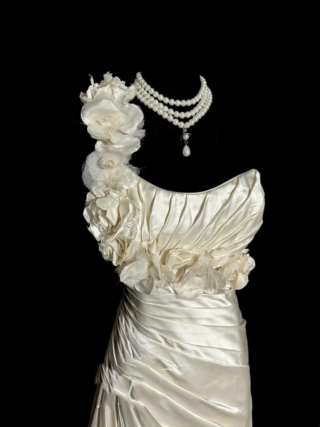Vintage Bridal Dress A line One Shoulder Ivory Satin Long Wedding Dress Simple Wedding Dresses Modest Wedding Gowns W876