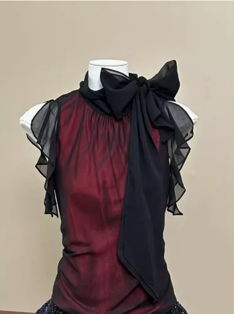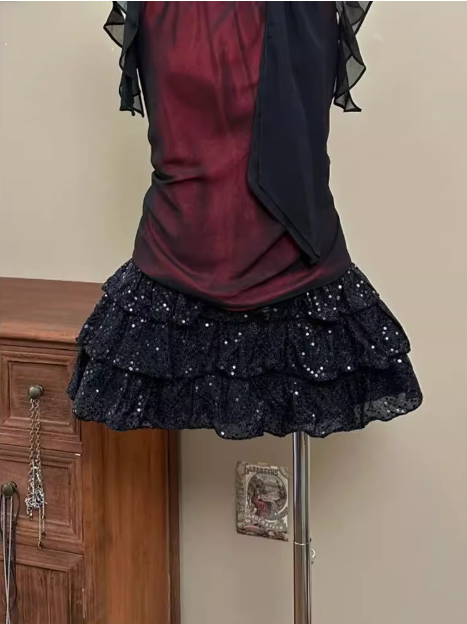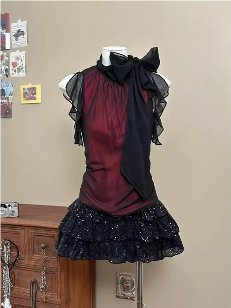 Vintage Burgundy Bow Black Sequin Mini Homecoming Dress P3423