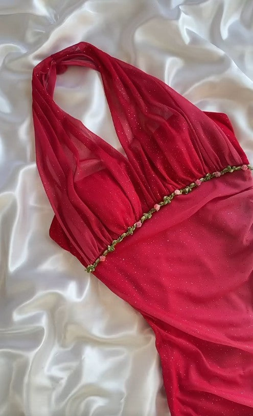 Vintage Gradient Red Halter Sheath Party Dress Elegant Gothic Glitter Chiffon Prom Dress ED02022
