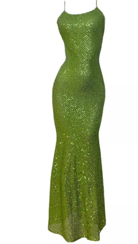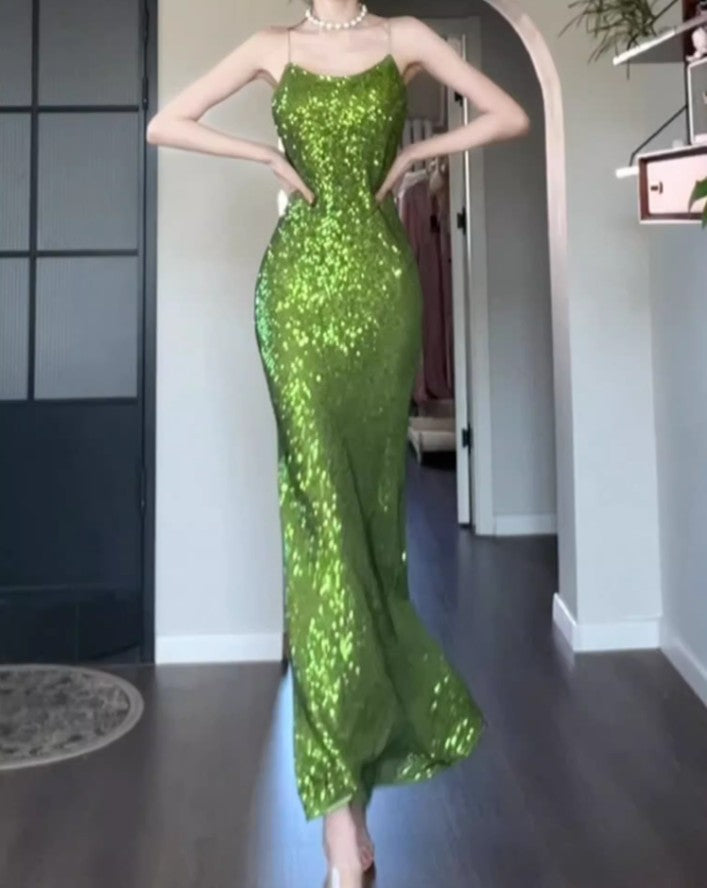 Vintage Green Sheath Spaghetti Strap Sequined Prom Dress Birthday Dress ED01774