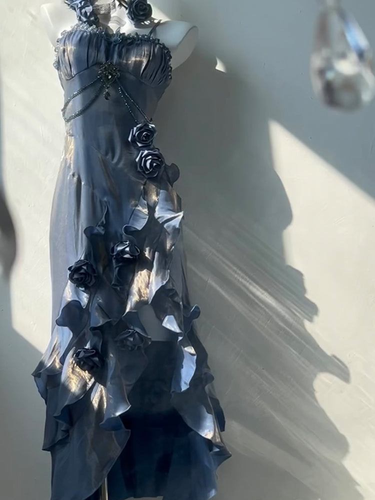 Vintage High Low Spaghetti Straps Blue 16th Birthday Dress With Sleeves Lolita Dress Satin Birthday Outfits DP0225