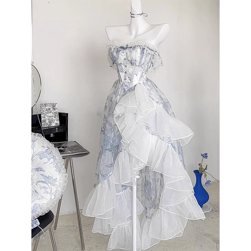 Vintage High Low Strapless Floor Length Light Blue Flowers Prom Dresses Birthday Dress SD467
