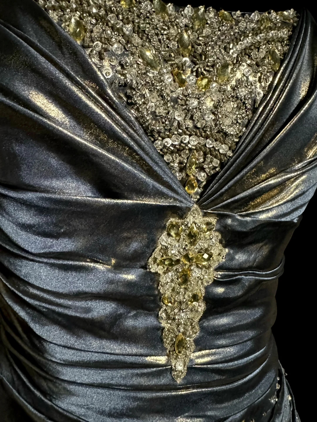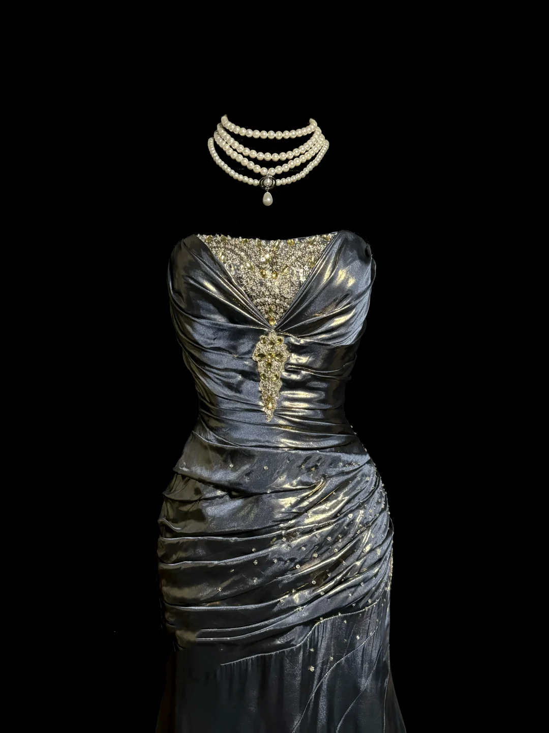 Vintage Mermaid Strapless Gray Satin 90s Long Prom Dresses Party Dress 30th Birthday Outfits Graduation Dresses W871
