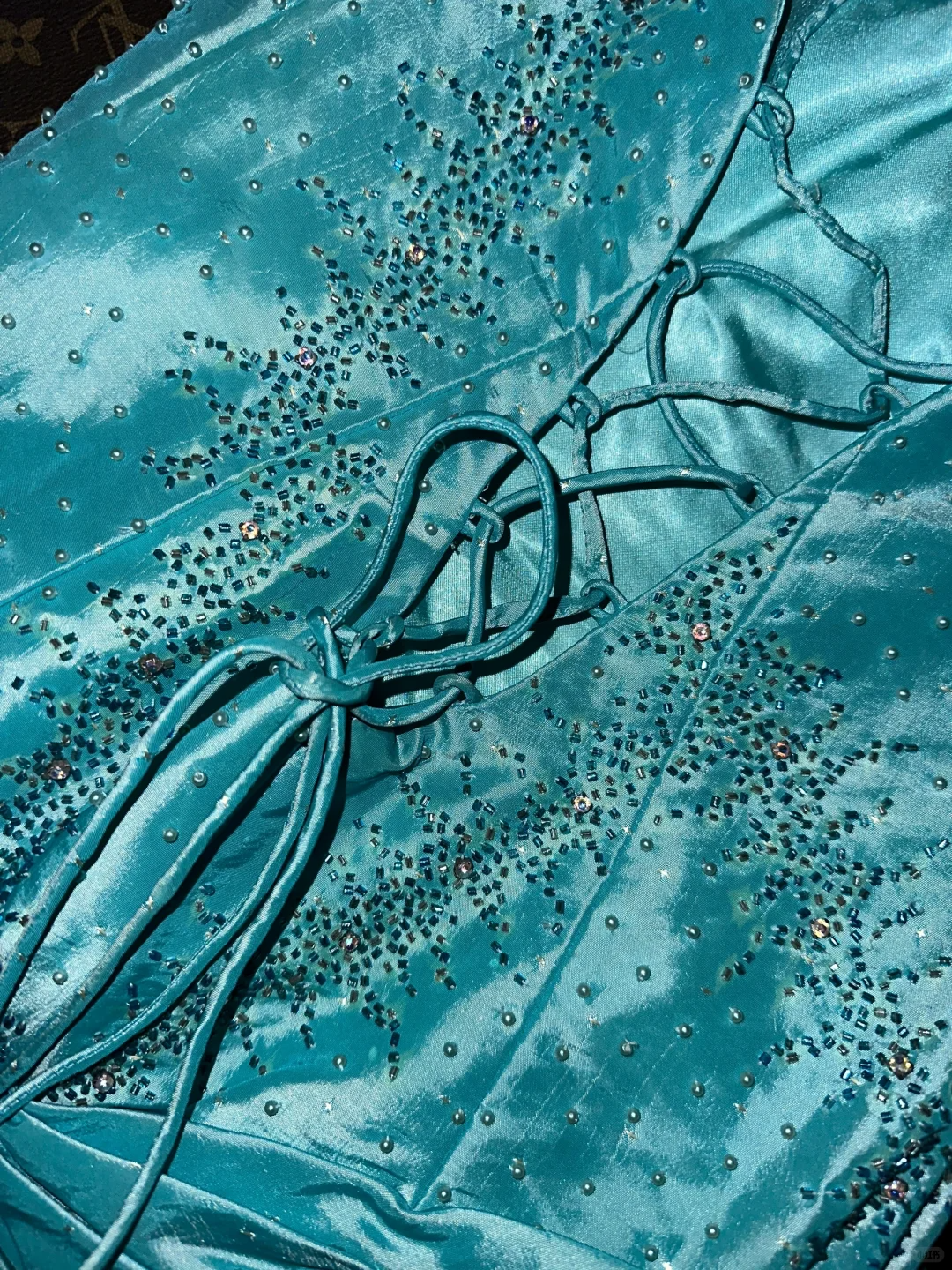 Vintage Mermaid Sweetheart Neck Beaded Blue Satin Long Prom Dress Evening Dress SH3160