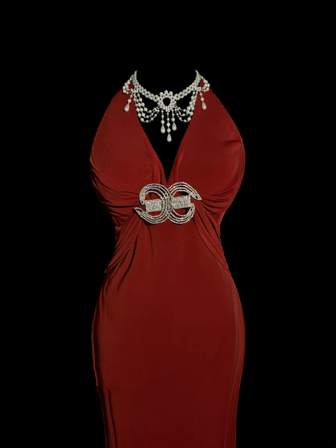 Vintage Mermaid V Neck Red 1950s Retro Classy Chiffon Long Prom Dresses Party Dress 21st Birthday Outfits Graduation Dresses W858