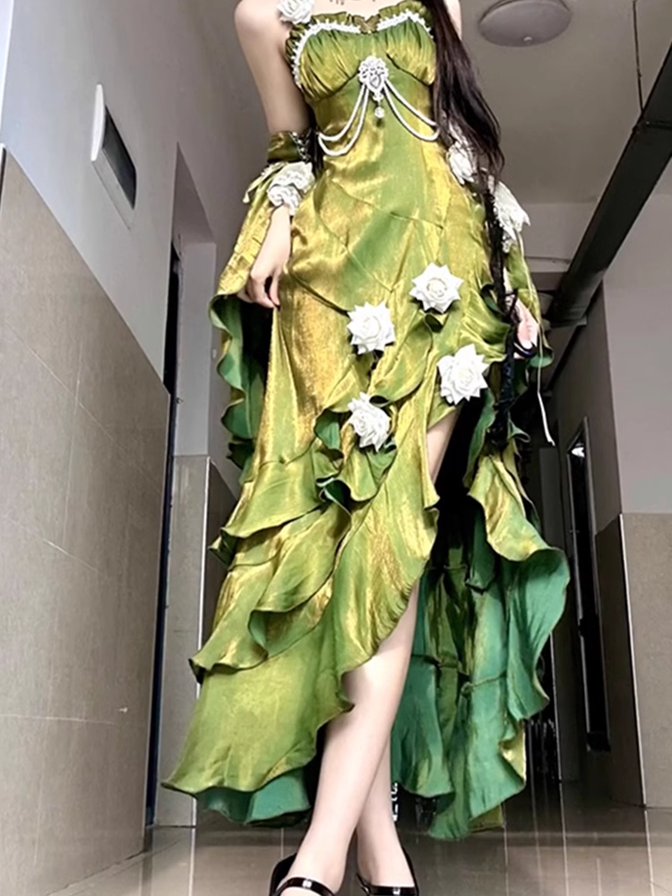 Vintage Sheath Irregular Ruffled Spaghetti Straps Women's Green Birthday Party Dresses SD437