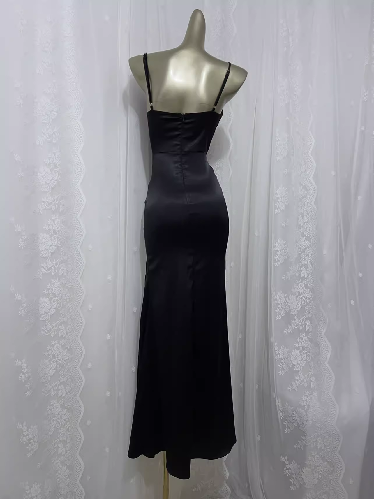Vintage Sheath Spaghetti Straps Black Vacation Dress Satin Birthday Dresses SD0025