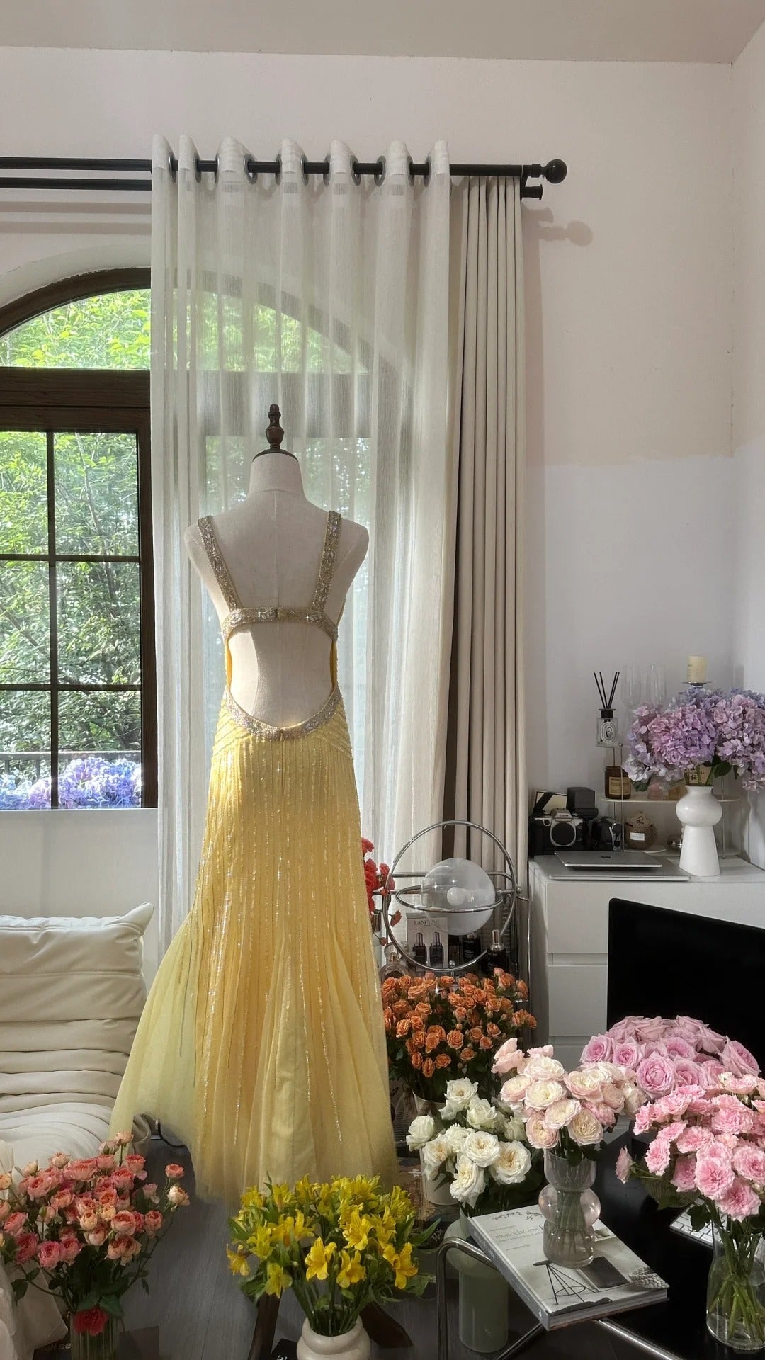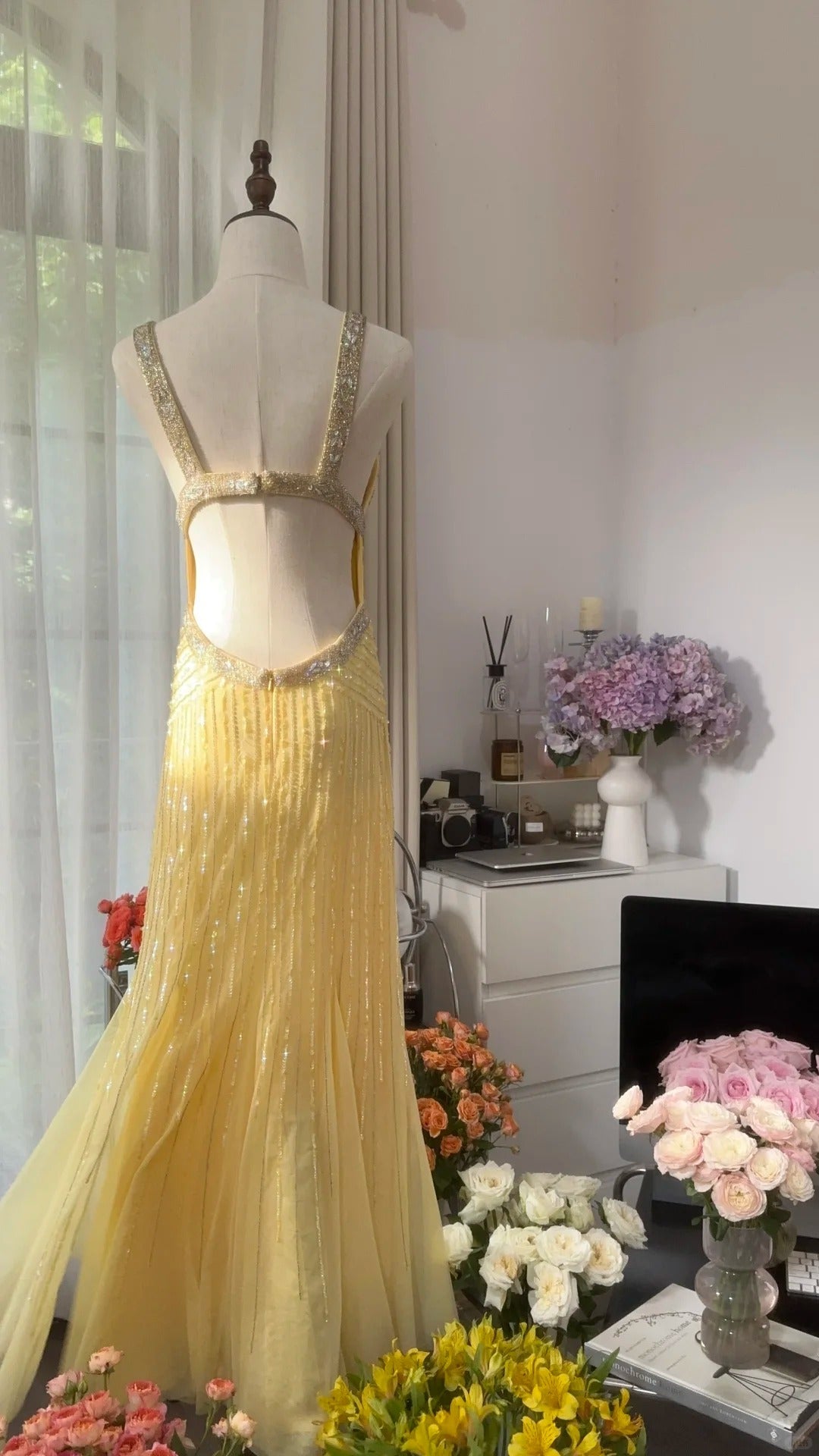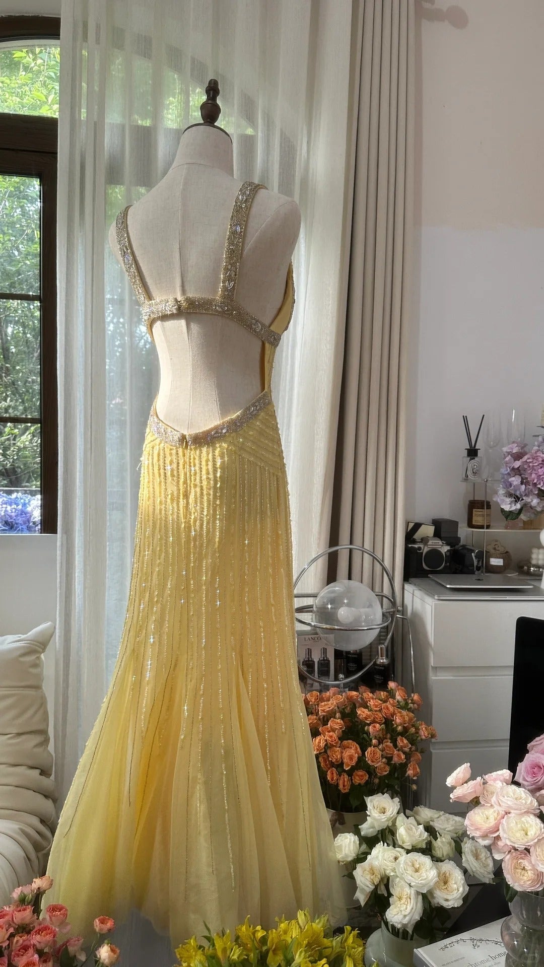 Vintage Yellow Backless Beaded Chiffon Long Prom Dress P3350