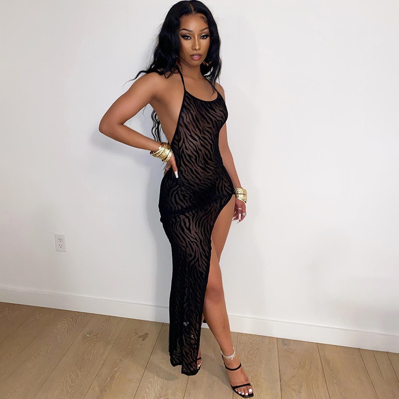 loveedsTM- Sexy Flocking Party Dress Women Halter Bandage Side Split Skinny Elastic Backless Maxi Bodycon Midnight Slim Clubwear