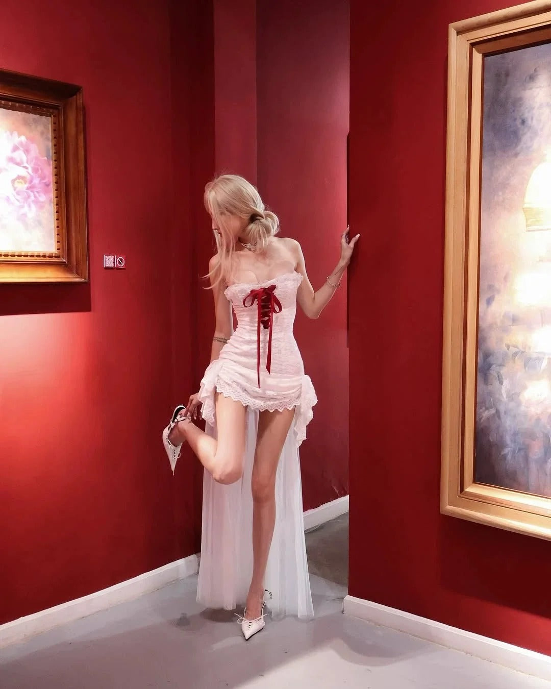 White and red satin lace tube top with short front and long back homecoming dress P3136