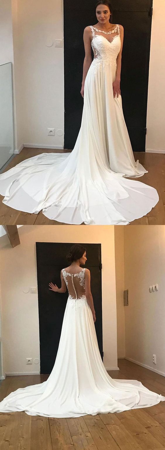 White chiffon lace long prom dress, white evening dress cg713