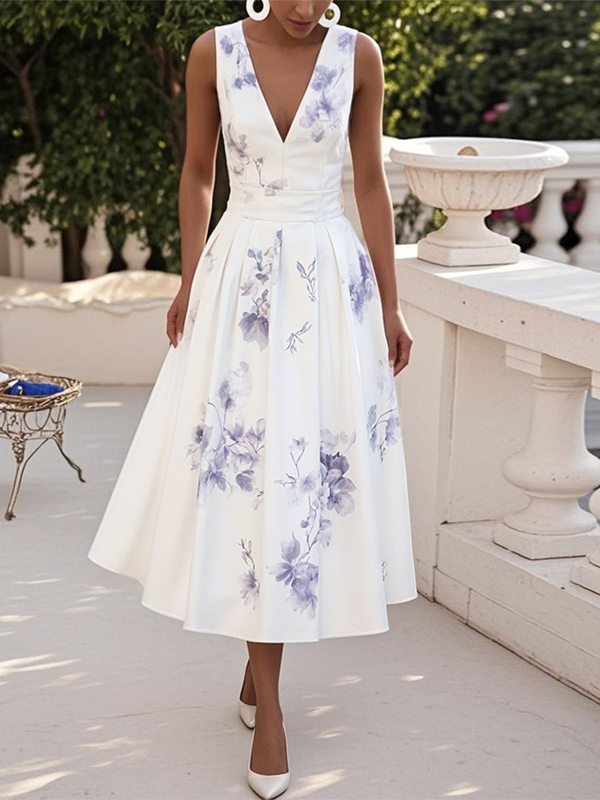 White Floral Classic V Neck Sleeveless A-Line Midi Dress