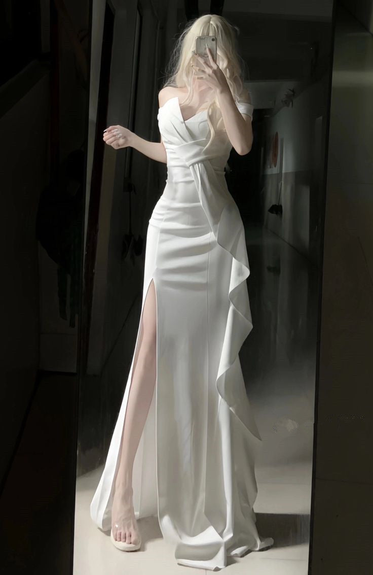 White Off Shoulder Long Prom Gown Evening Dress fg7392