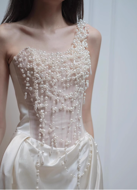 White One Shoulder Beaded Satin French Light Wedding Dress P2698