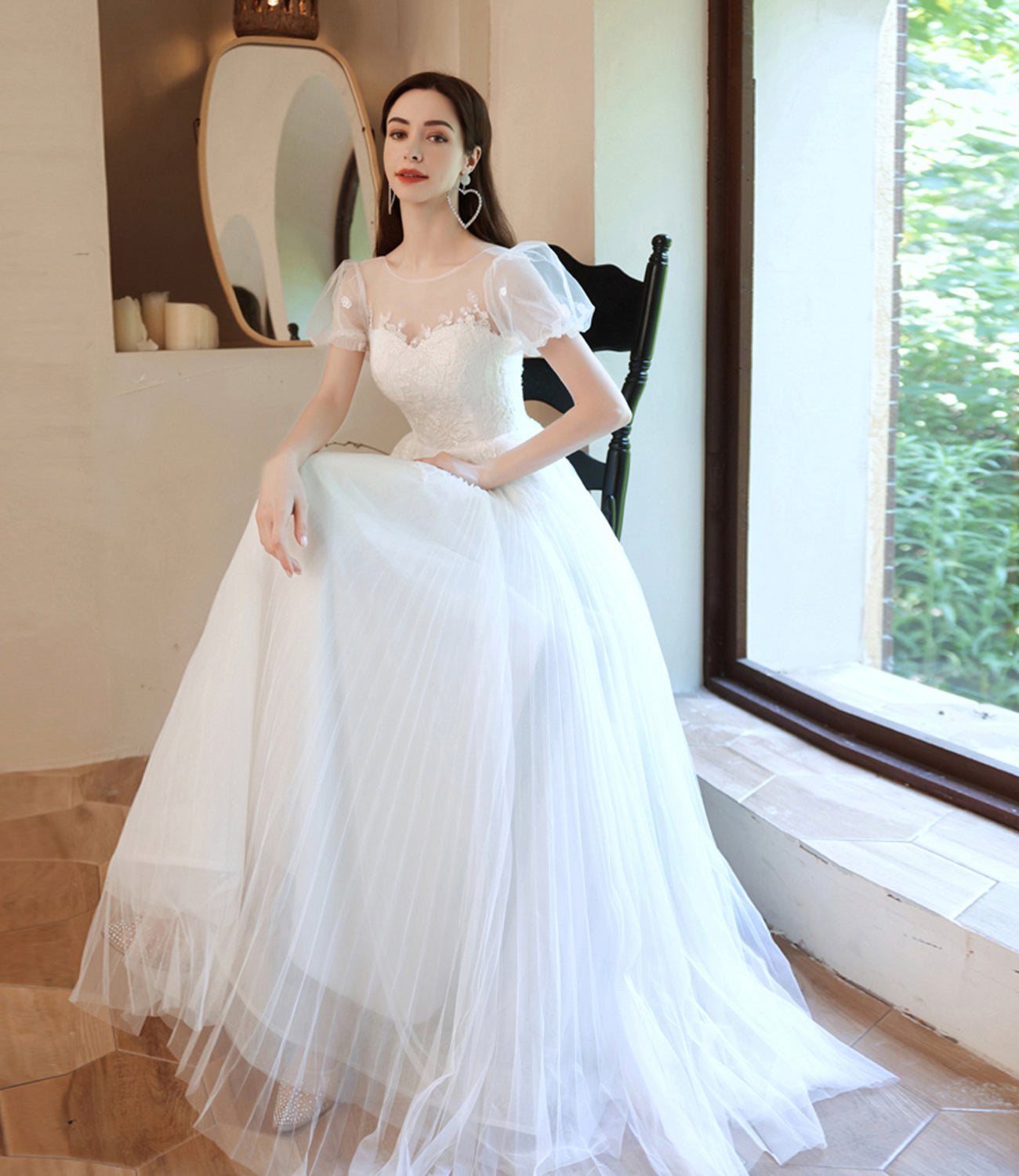 White tulle lace long prom dress A line evening gown