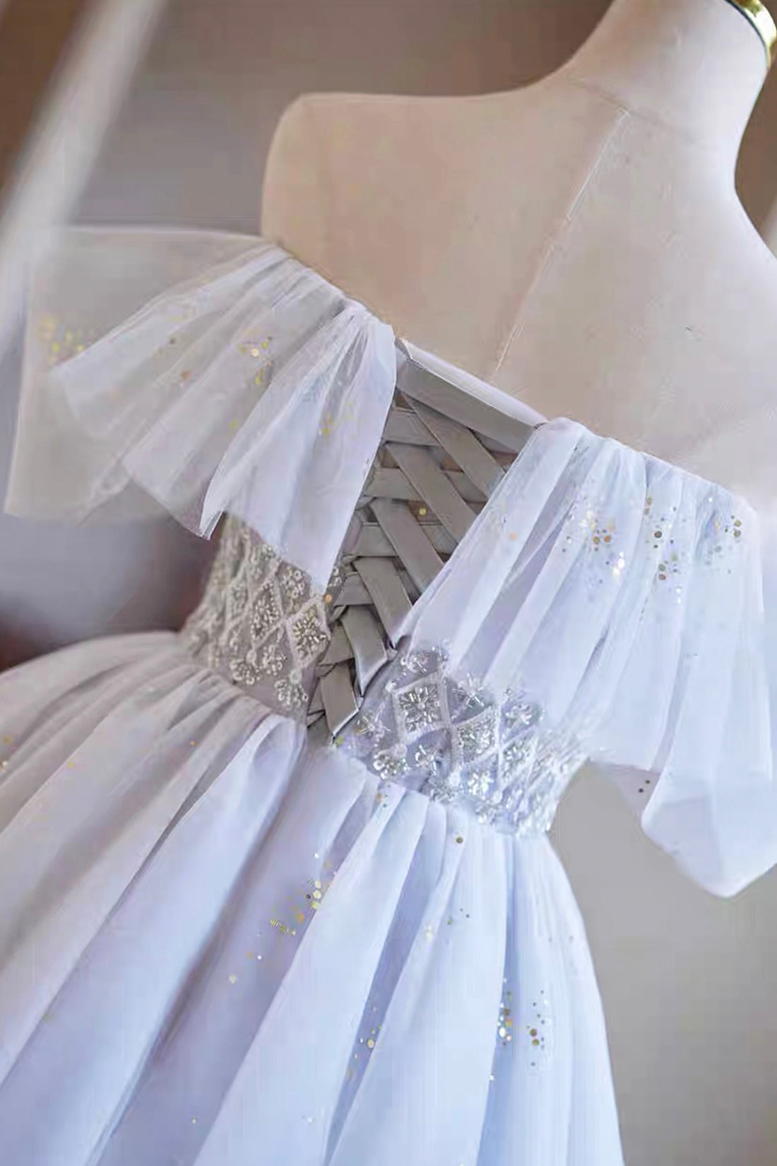 White Tulle Sequins Short Prom Dress, A-Line Off the Shoulder Evening Party Dress