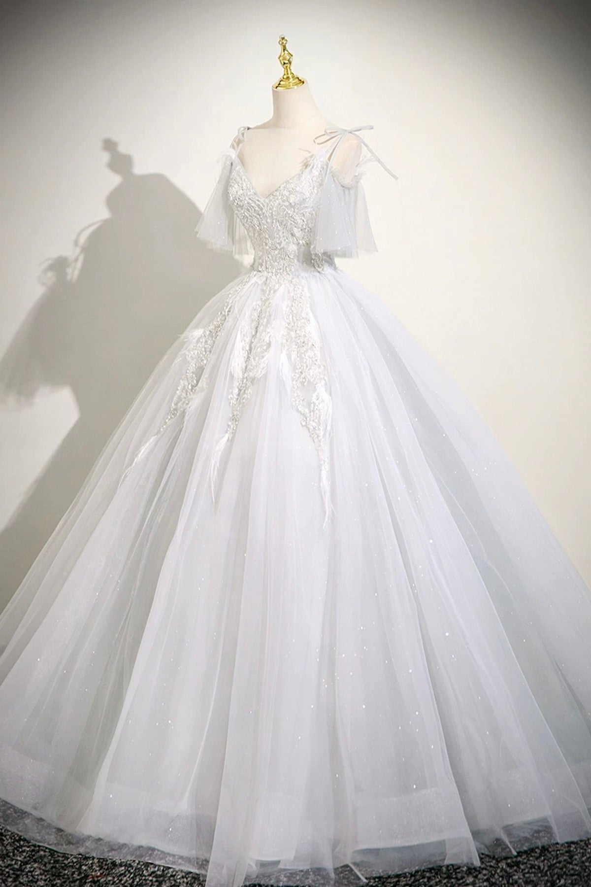 White V-Neck Tulle Long Prom Dress, Beautiful A-Line Evening Dress