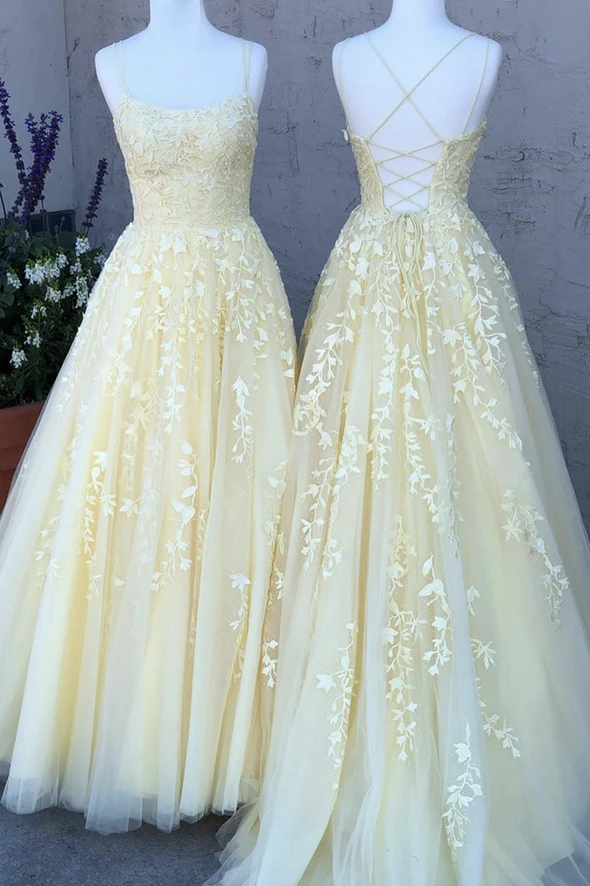 Yellow lace long A line prom dress yellow evening dress KS2488
