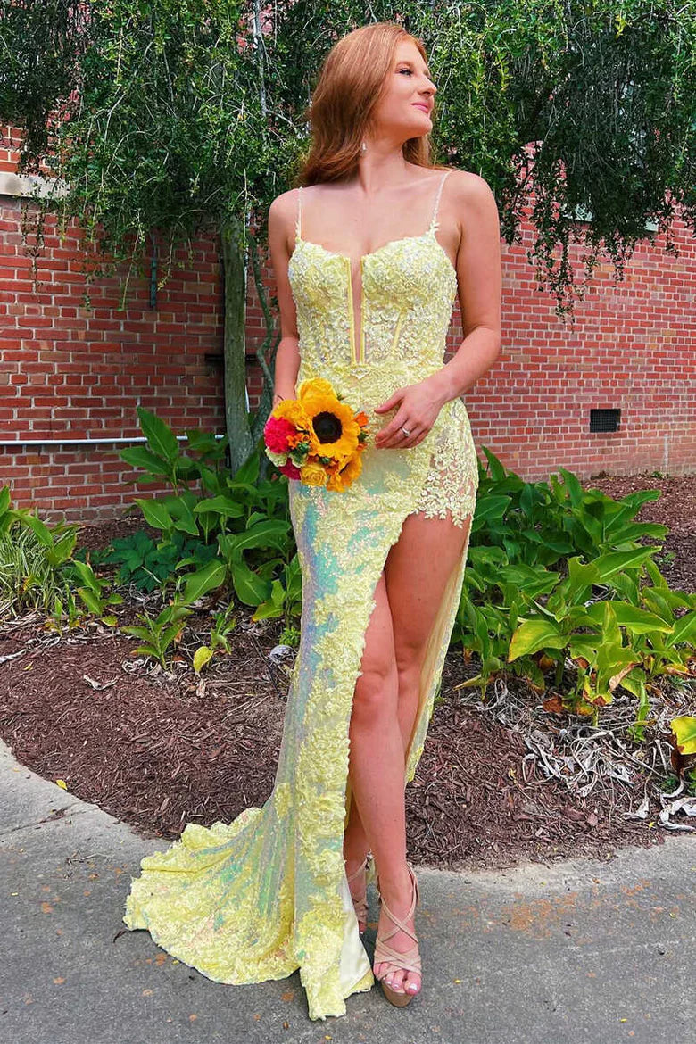 Yellow Sheath V-neck Appliques Sequins Prom Dress With Slit SH1650