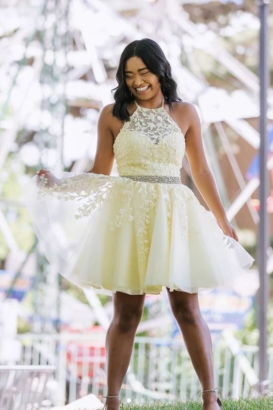 Yellow Tulle Lace Short Prom Dress Beading A Line Homecoming Dress KP41