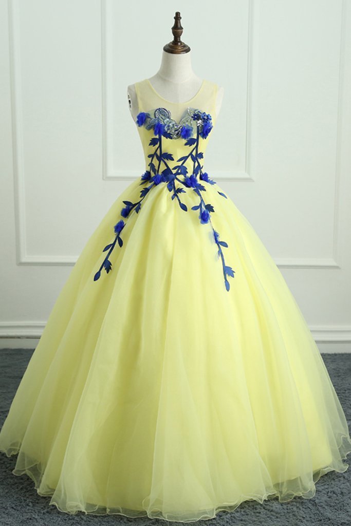 Yellow Tulle Long Flower Applique Evening Dress, Sweet 16 Prom Dress V19