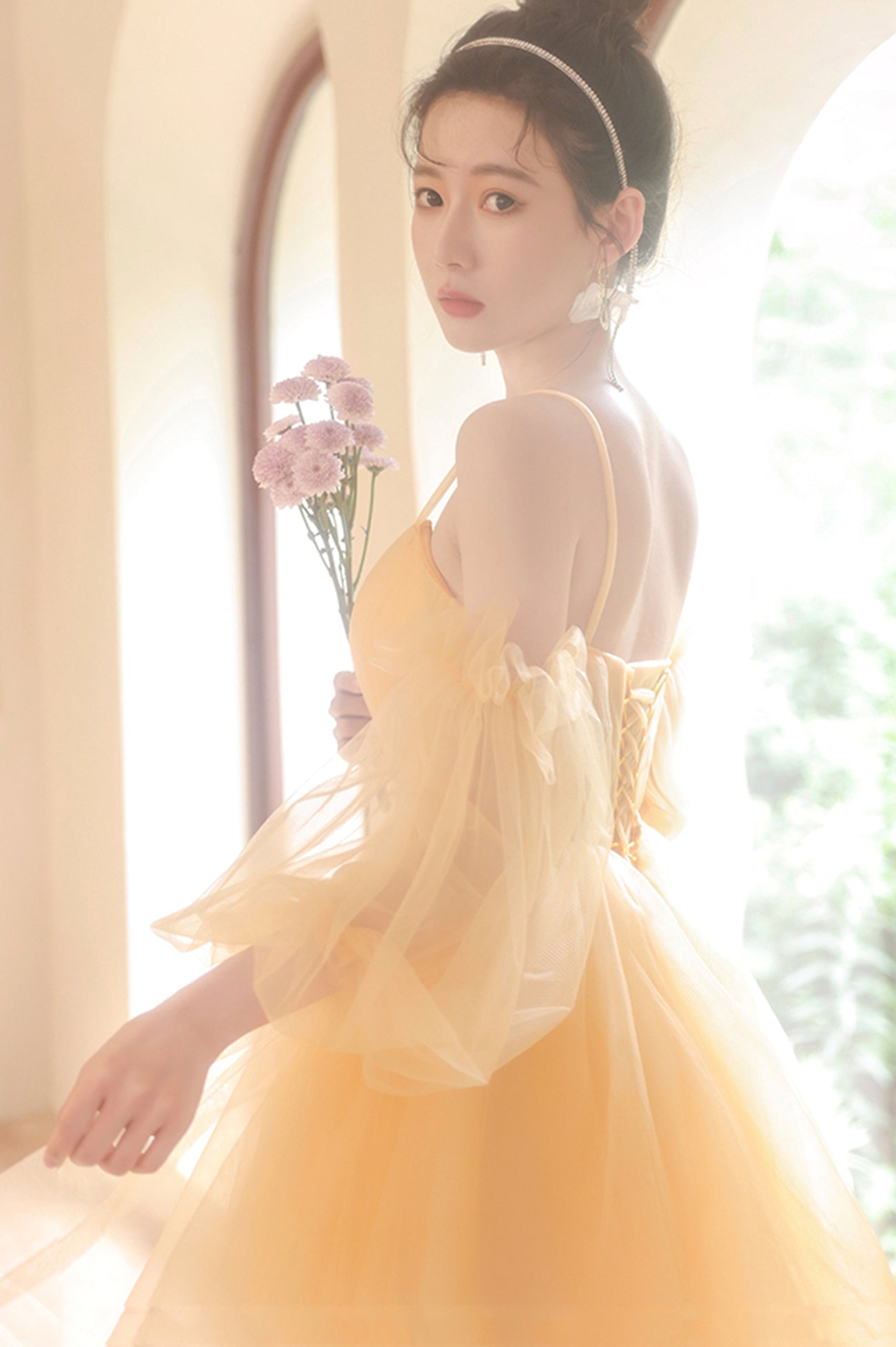 The Yellow Tulle Short A-Line Prom Dress is a vibrant choice for homecoming. With its lively yellow hue and A-line silhouette, it radiates youthful charm and style, perfect for dancing the night away.