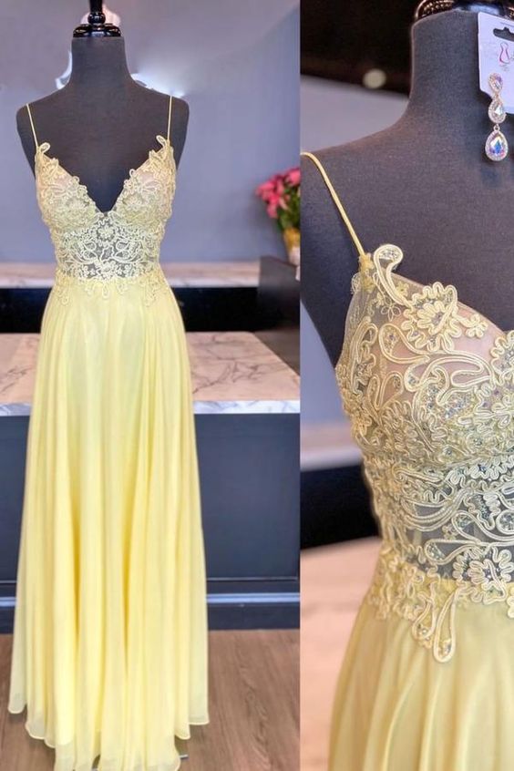 Yellow v neck chiffon lace long prom dress yellow evening dress NN301